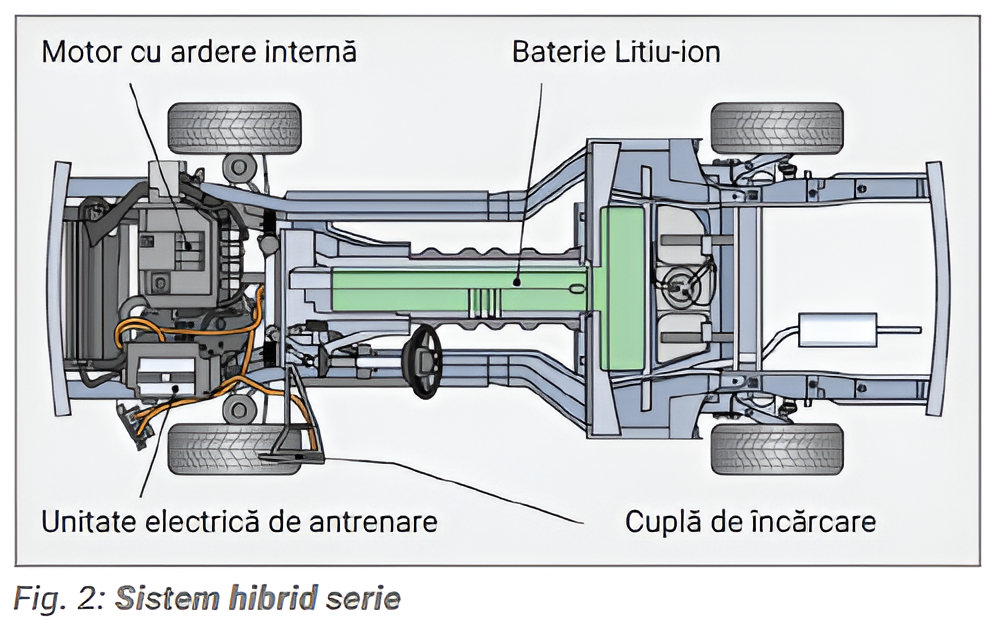 Sistemele hibrid serie include de asemenea vehiculele electrice, care au un motor cu ardere internă suplimentară (Fig. 2).