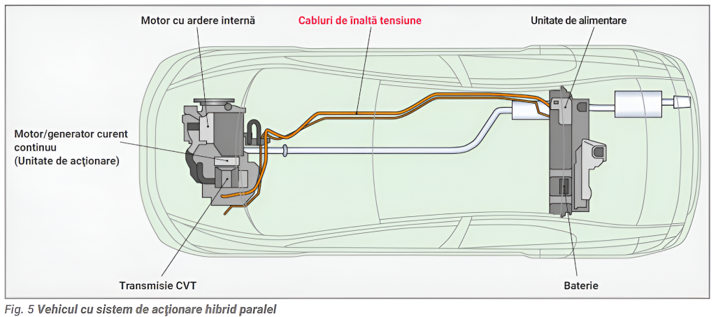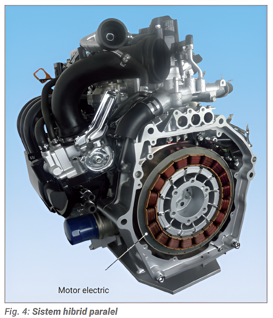 Într-un sistem hibrid paralel, motorul cu combustie internă și motorul electric acționează împreună pentru a antrena roțile.