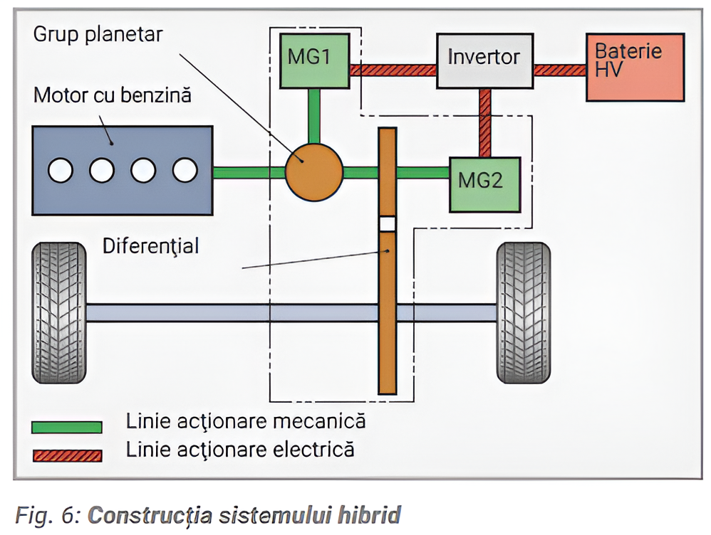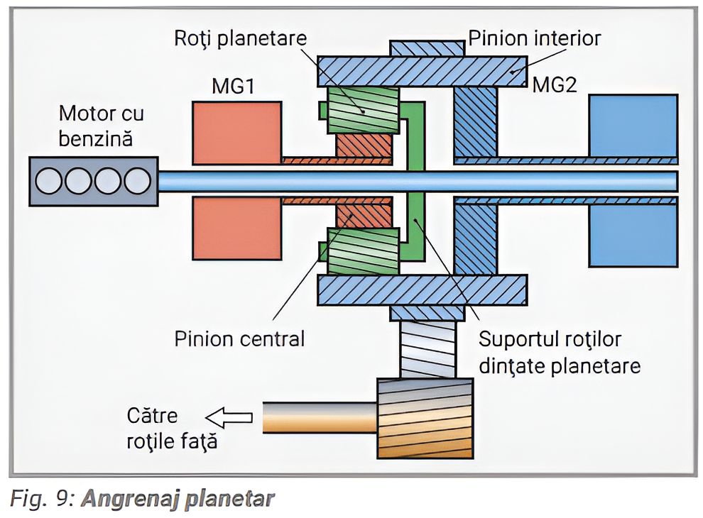 Pentru cuplarea mecanică a motorului cu ardere internă și a unuia sau a două motoare electrice (MG1 și MG2) unul cu celălalt (Fig.6) se utilizează un dispozitiv mecanic, cum ar fi un angrenaj planetar.