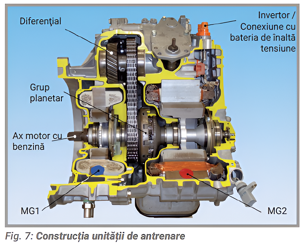 Construcția unității de antrenare. Aceasta constă în motoarele generator MG1 și MG2, unitatea angrenajelor planetare și diferențialul (Fig. 7). Acesta include, de asemenea, o conexiune la invertor sau la baterie.