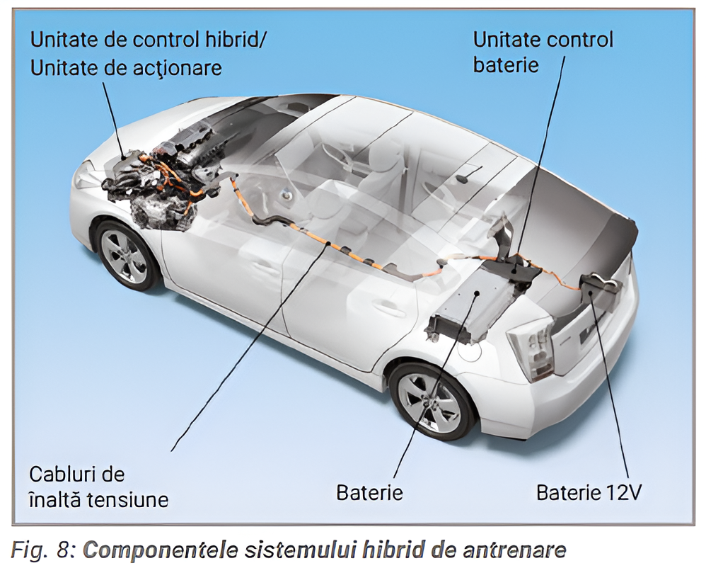 Bateria alimentează unitatea de antrenare cu o tensiune de 200 până la 300 de volți Invertorul transformă curentul continuu în curent alternativ . Un cablu de înaltă tensiune conectează motoarele electrice cu invertorul. Bateria de înaltă tensiune este amplasată în partea din spate a vehiculului. (Fig. 8)