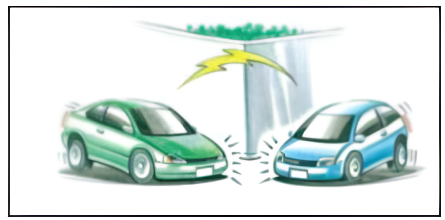 În figura de mai sus, spre deosebire de fig 7, este ilustrat aceeaşi situaţie în cazul a două vehicule cu traiectorii ce se intersectează. Ele comunică între ele şi se avertizează una pe cealaltă sonor şi vizual.