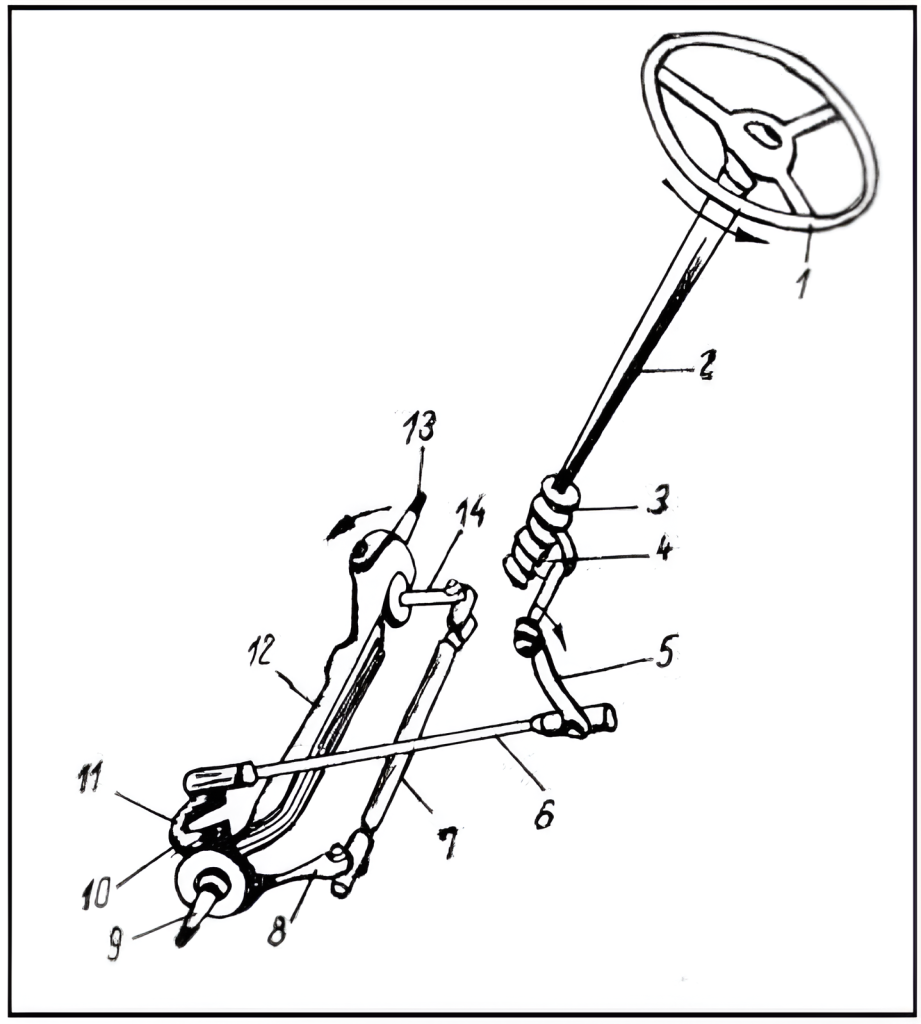 Prin deplasarea axială a barei longitudinale de direcţie, braţul fuzetei 11 va roti fuzeta 9 în jurul pivotului 10 şi o dată cu ea şi roata din stânga. Legătura care există între fuzeta 9 şi fuzeta 13, prin intermediul levierelor 8 şi 14 şi bara transversală de direcţie 7, va produce rotirea fuzetei 13.