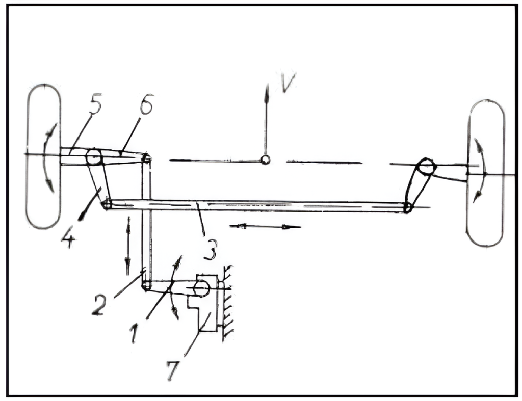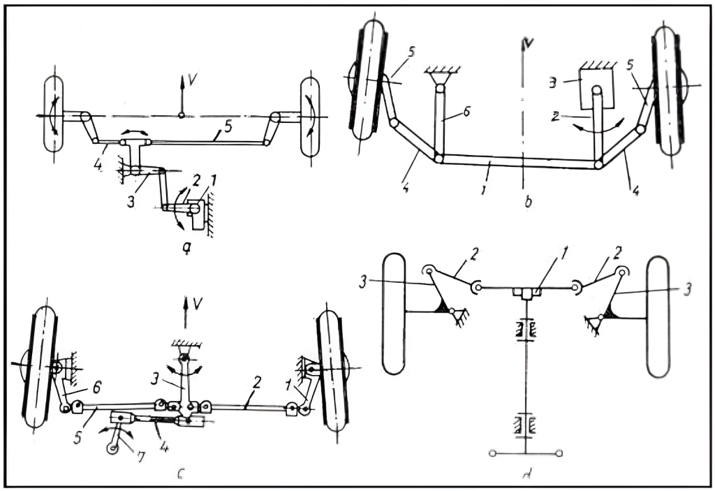 1 – levierul de direcţie ; 2 – bară longitudinală de direcţie; 3- bară transversală de direcţie; 4 – levierele fuzetelor; 5- fuzete ; 6 - braţul fuzetei; 7 – mecanismul de acţionare.