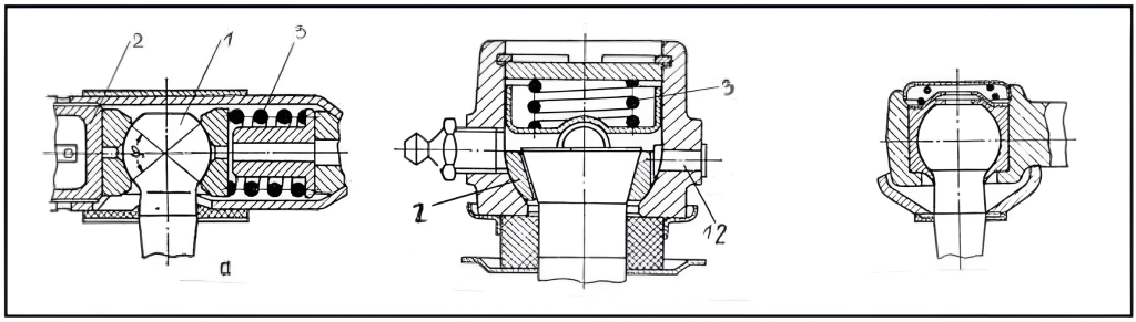 Intensitatea şocurilor care se transmit mecanismului de acţionare a direcţiei şi volanului depinde de tipul constructiv al acestor articulaţii sferice. Articulaţiile sferice trebuie unse periodic, pentru aceasta prevăzându-se cu un gresor. În ultima vreme pentru simplificarea întreţinerii, se folosesc pe scară tot mai largă articulaţiile sferice capsulate fig. La aceste articulaţii partea sferică a bolţului şi pastilele au aplicate pe ele un strat din material plastic de cca. 2,5 mm, impregnat cu bisulfură de molibden pentru reducerea frecării. Articulaţia este umplută la montare cu o unsoare pe bază de calciu şi capsulată.