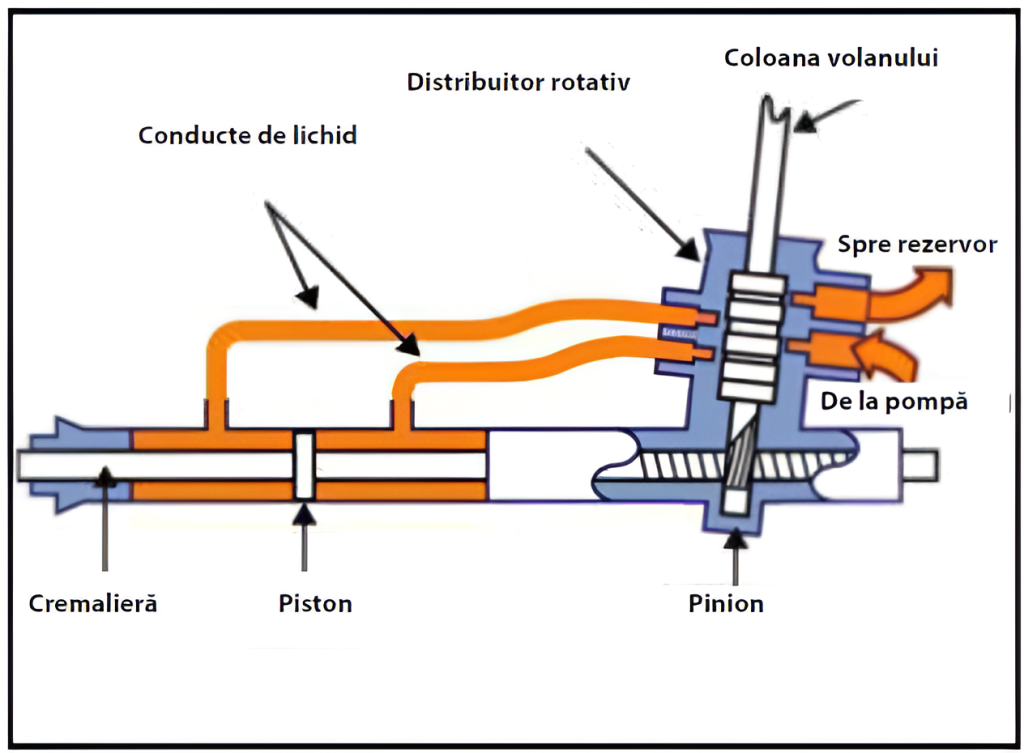 cremaliera. În acelaşi timp coloana volanului acţionează şi distribuitorul rotativ care deschide circuitul spre cilindrul hidraulic cu piston. Trebuie menţionat că pistonul este solidar cu cremaliera. În funcţie de sensul de rotire a volanului lichidul sub presiune ajunge în cilindrul hidraulic în dreapta sau stânga pistonului. Astfel peste forţa de acţionare a şoferului se suprapune forţa dată presiunea uleiului şi acţionarea direcţiei se face mult mai uşor. Dacă volanul nu se mişcă distribuitorul hidraulic revine la poziţia iniţială şi întrerupe curgerea uleiului spre cilindrul hidraulic.