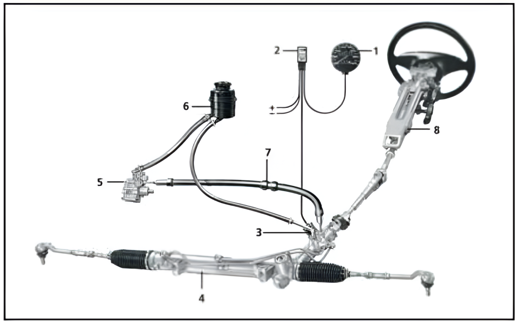 distribuitor hidraulic rotativ; 4- casetă de direcţie cu pinion şi cremalieră; 5- pompă hidraulică; 6- rezervor de lichid; 7- racord flexibil; 8- coloana volanului.