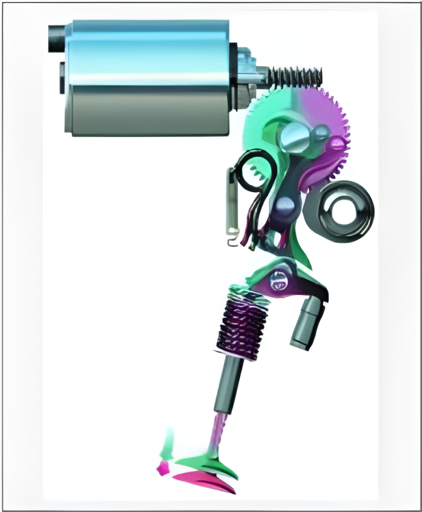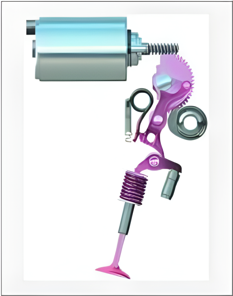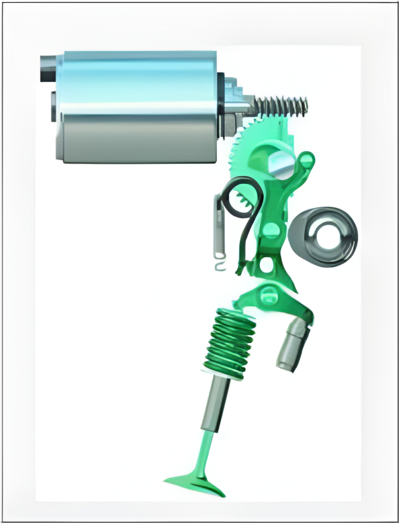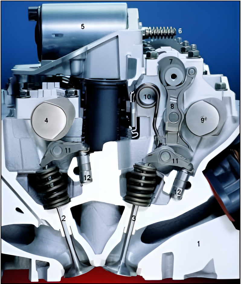 Deschiderea supapei de admisie (3) se realizează prin intermediul levierului intermediar (8) poziționat între arborele cu excentric (7) și culbutor (11). Arborele cu came (9) acționează asupra levierului intermediar care apasă pe supapa de admisie. Înălțimea de ridicare a supapei de admisie este ajustată în funcție de poziția arborelui cu excentric. Astfel, deschiderea supapei se realizează prin combinarea mișcării arborelui cu came cu cea a arborelui cu excentric.