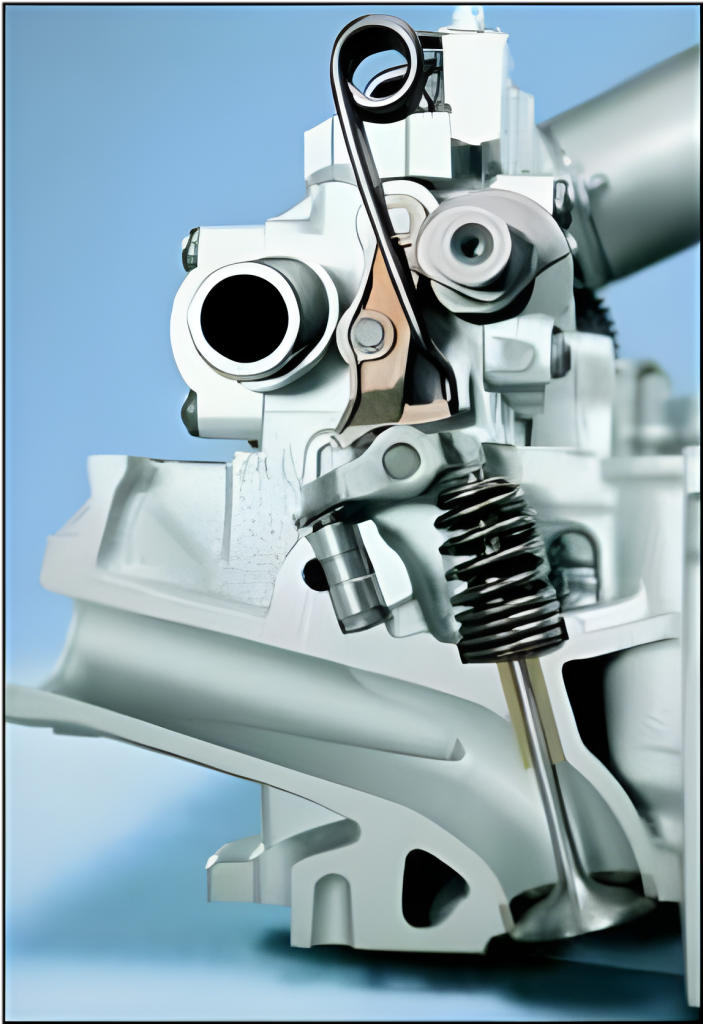 Pentru reducerea frecărilor dintre piesele aflate în mișcare, toate zonele de contact dintre arborele cu excentric (7), levier intermediar (8), culbutor și arbore cu came utilizează rulmenți cu role.