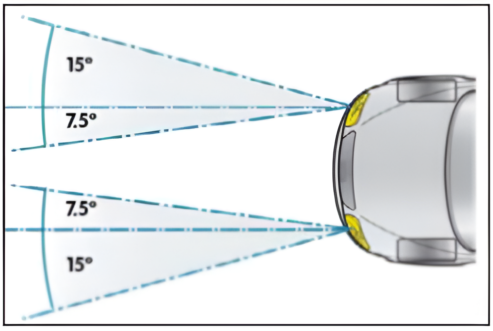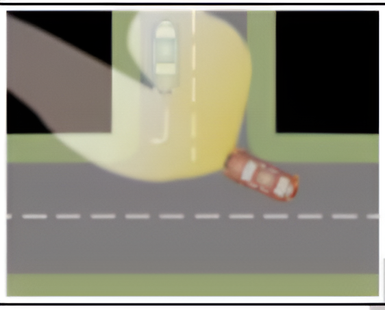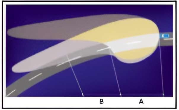 Conul de lumină mai întunecat reprezintă iluminarea cu un sistem de fază scurtă tradiţional. Acesta iluminează zona A a drumului. O mare parte din conul de lumină, iluminează zone din afara drumului. Conul de lumină mai deschis prezintă iluminarea cu un sistem dinamic de lumini de curbe, care iluminează zona B a drumului.