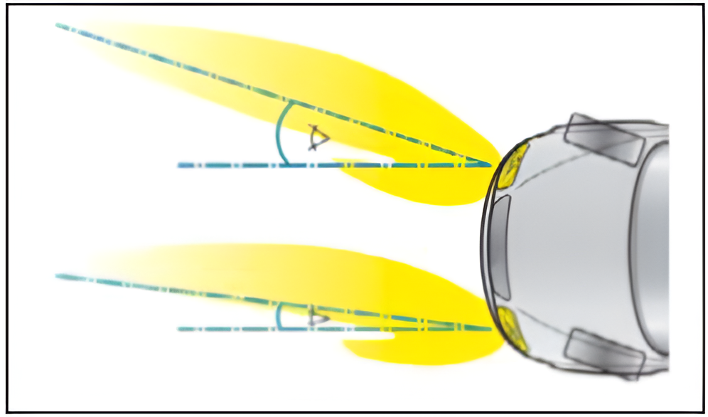 Unghiurile de pivotare diferite furnizează o mai bună iluminare a carosabilului în cadrul virajelor. Modulul din interiorul axului pivotează de două ori mai mult, faţă de modulul din exteriorul curbei. Maximul de suprafaţă iluminată se realizează atunci când există o distribuţie egală de lumini.