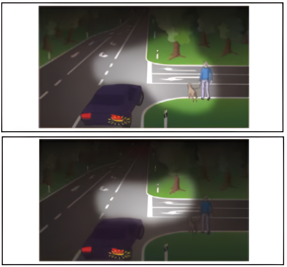 În prima imagine prezintă iluminarea carosabilului în cazul unei virări a unui autovehicul dotat cu faruri tradiţionale de fază scurtă, iar în a doua imagine se observă iluminarea carosabilului realizată cu ajutorul unor lumini statice de curba statice.