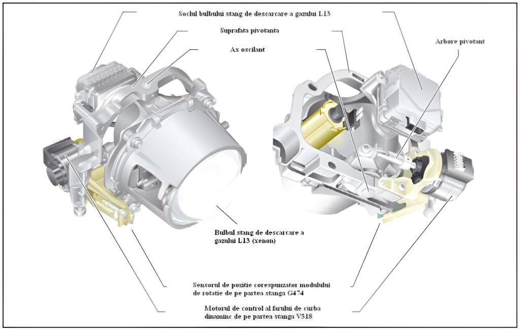 Sistemul dinamic al farurilor de curbe pivotează orizontal bulbul becului corespunzător fazei scurte cu ajutorul unui motor integrat. Unghiul de pivotare este de aproximativ 15grade pe partea din interiorul curbei şi de 7.5grade pe partea exterioară curbei.