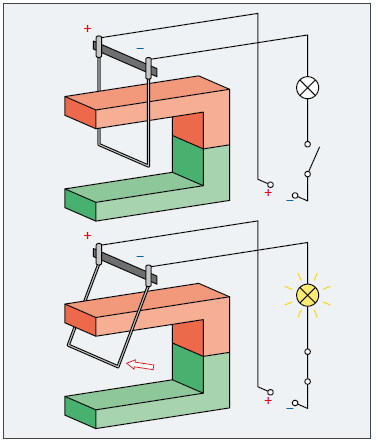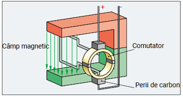 Dacă se formează o buclă din conductor, la trecerea curentului se generează un cuplu care va aduce bucla în poziția orizontală. Pentru a roti mai departe bucla, direcția curentului trebuie inversată. Acest lucru se realizează printr-un schimbător de curent (comutator sau colector, Fig. 3).