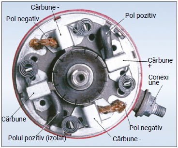Pe placa de perii din Fig. 6, două perii sunt conectate la polul pozitiv și două la polul negativ al bateriei (respectiv la masa vehiculului). Prin intermediul periilor de carbon, curentul electric ajunge în înfășurarea rotorului.