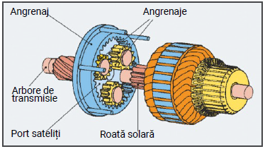 Pentru a utiliza o gamă de turație favorabilă pentru demaror, în carcasa demarorului poate fi integrat un angrenaj planetar (Fig. 9). Turația mare a motorului demarorului este redusă la turația de pornire.