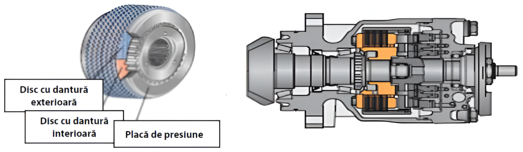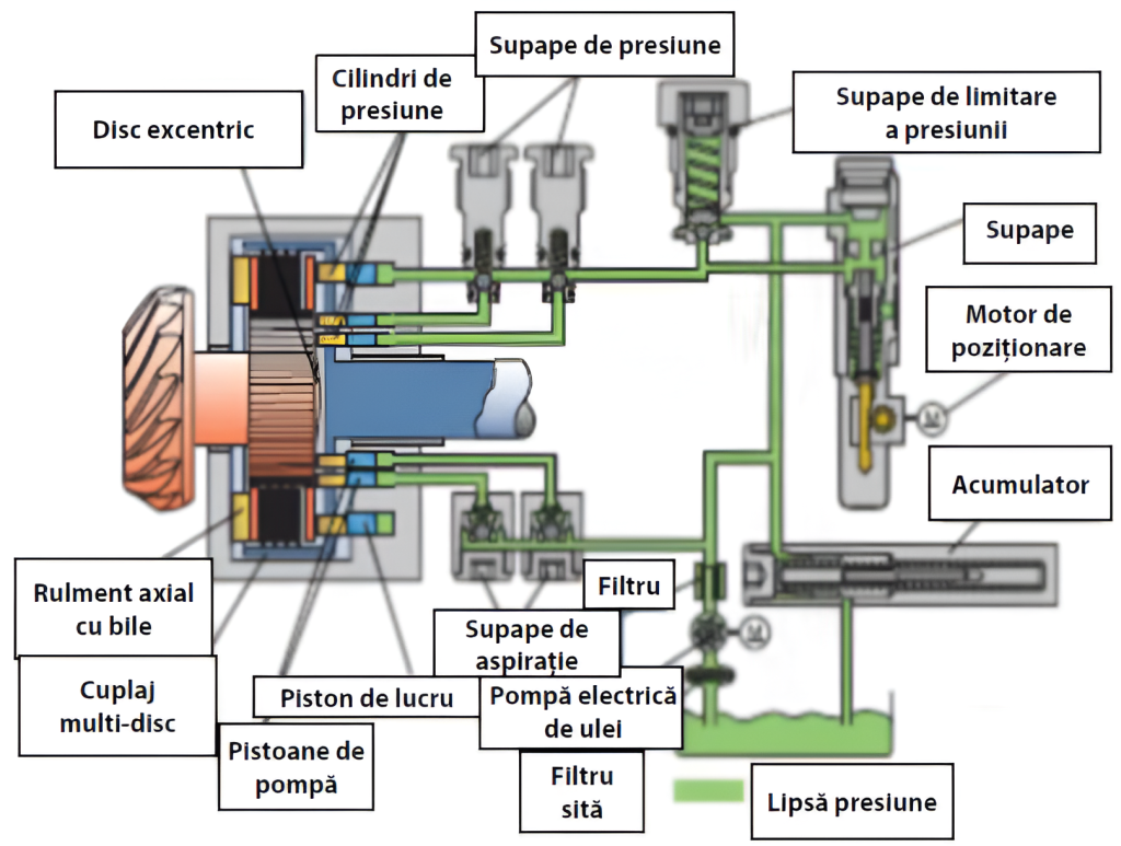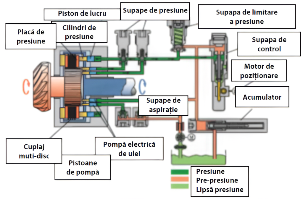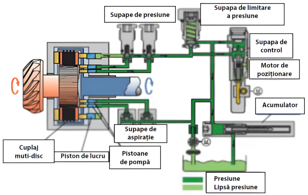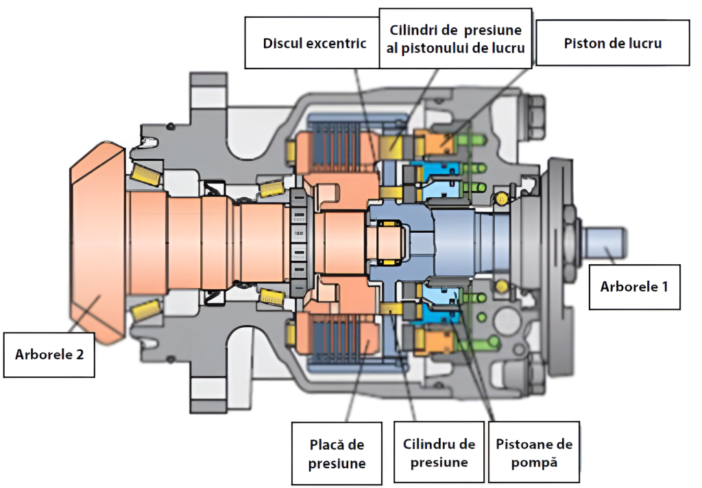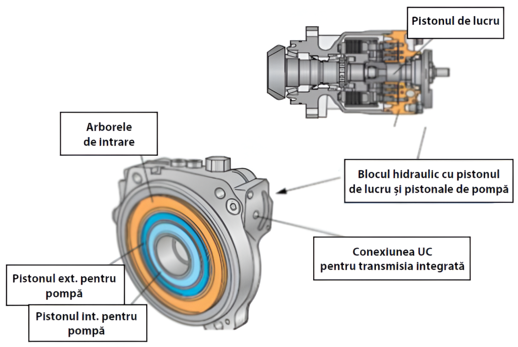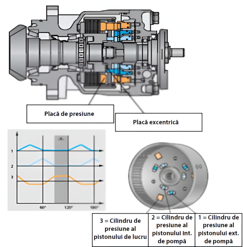NOTĂ: Pentru prezentarea schematică a sistemului hidraulic, pistoanele pompă au fost arătate poziţionate aproape unul după altul iar placa excentrică cu două came şi două goluri. Ca o reamintire: pistoanele pompă sunt poziţionate decalat. Discul excentric are trei came decalate cu 120⁰ cu o ridicare de 1,2 mm