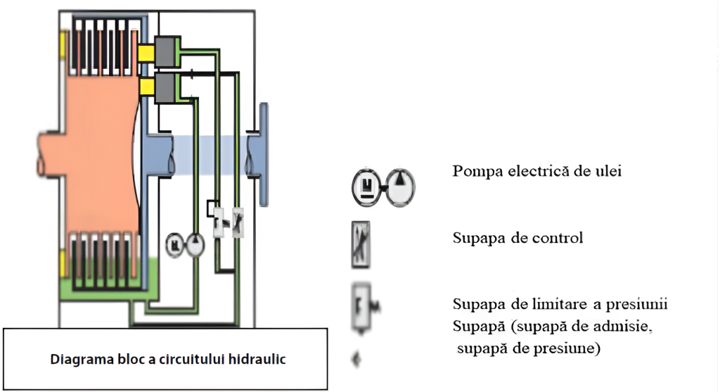Supapa de limitare a presiunii determină presiunea maximă la setul multidisc când supapa de control determină momentul transmis prin cuplajul multi-disc.