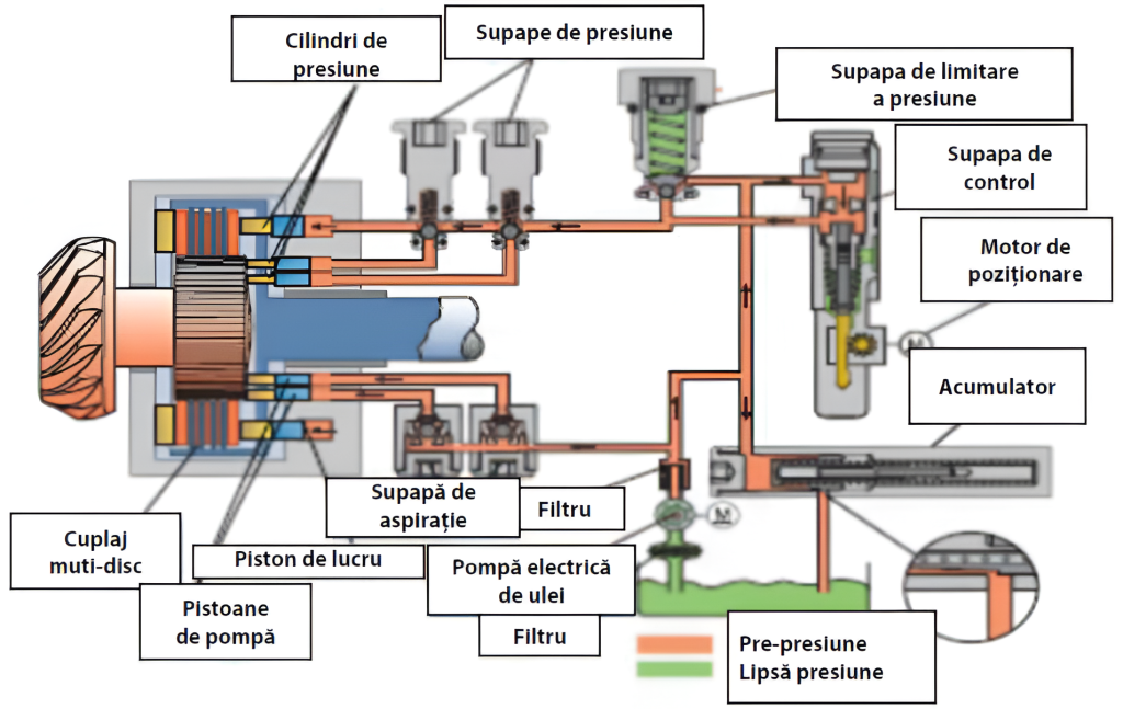 Cuplajul Haldex intră în funcţiune în foarte scurt timp. Presiunea maximă este disponibilă cel mai târziu după un unghi de rotaţie de 45⁰ . Pe de altă parte, setul multi-disc are un joc cert dacă cuplarea este “inactivă”, dar el trebuie să aibă posibilitatea , să elimine acest joc foarte rapid.Iată de ce sistemul funcţionează cu o pre-presiune. Pistoanele pompă sunt concepute flotante şi fac contact numai după ce presiunea este asigurată de către pompa electrică de ulei. Această pompă funcţionează dacă aprinderea este conectată şi turaţia motorului este mai mare de 400 rot/min. Pompa de ulei trage uleiul din rezervorul aflat în carcasa cuplajului printr-un filtru şi-l pompează printr-un filtru în supapele de aspiraţie la pistoanele de pompă.