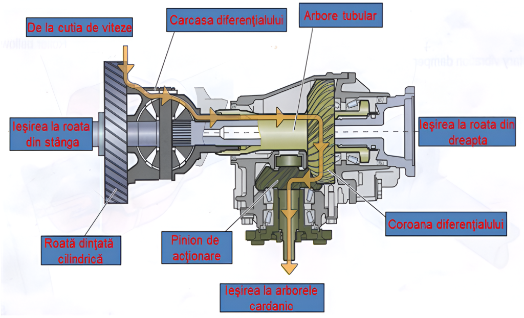 Momentul este transferat de la roata dinţată cilindrică prin carcasa diferenţialului la arborele tubular cu coroana diferenţialului şi prin pinionul de acţionare la arborele cardanic.