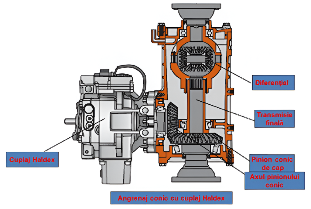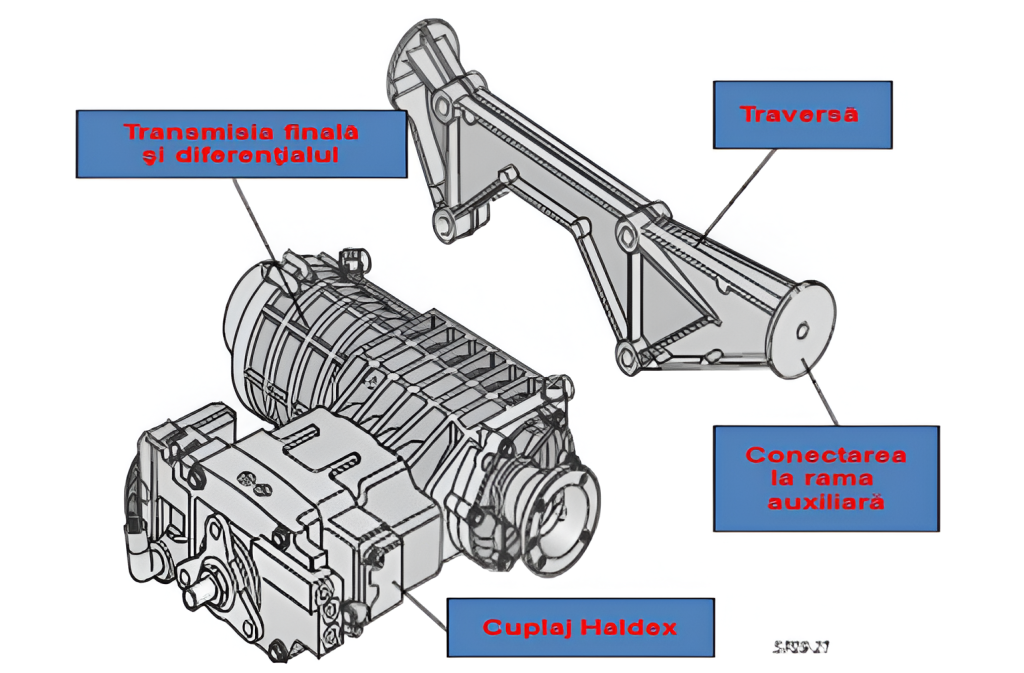 Carcasa cuplajului Haldex este fixată la carcasa transmisiei finale. Acest montaj determină ,de asemenea, jocul transmisiei prin angrenaj conic când funcţionează.