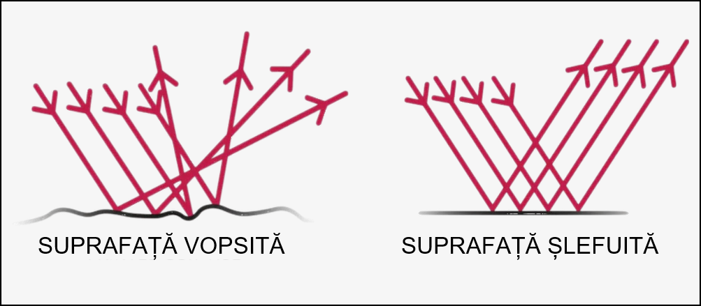 O suprafață neuniformă a vopselei este ușor de identificat deoarece lumina care ricoșează pe ea se va reflecta în direcții diferite. Acest lucru este ceea ce face ca defectele de pe suprafață să fie vizibile cu ochiul liber - într-un fel, nu sunt defectele reale pe care le vedeți, ci natura aleatorie a luminii care ricoșează în ele. Prin nivelarea suprafeței, lumina se va reflecta în ochi într-un mod mai uniform, ceea ce face ca suprafața să pară mai strălucitoare și dă efectul unei vopsele mai adânci.