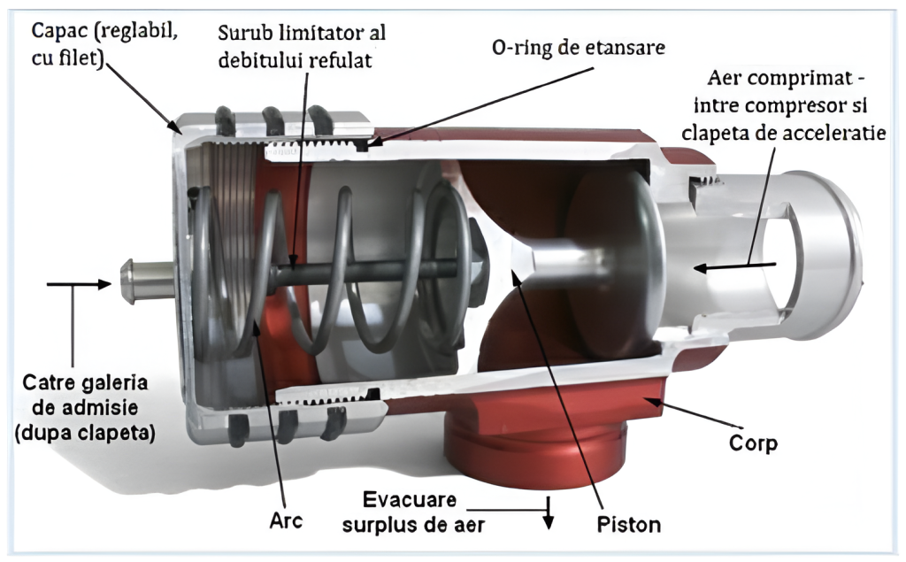 Relativ simplă din punct de vedere constructiv, BOV este o supapă cu membrană sau piston menţinută în poziţia “închis” de un arc cu o forţă prestabilită. Aceasta se montează pe traseul dintre compresor şi galeria de admisie, înaintea clapetei de acceleraţie.
