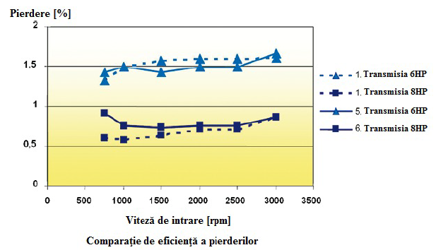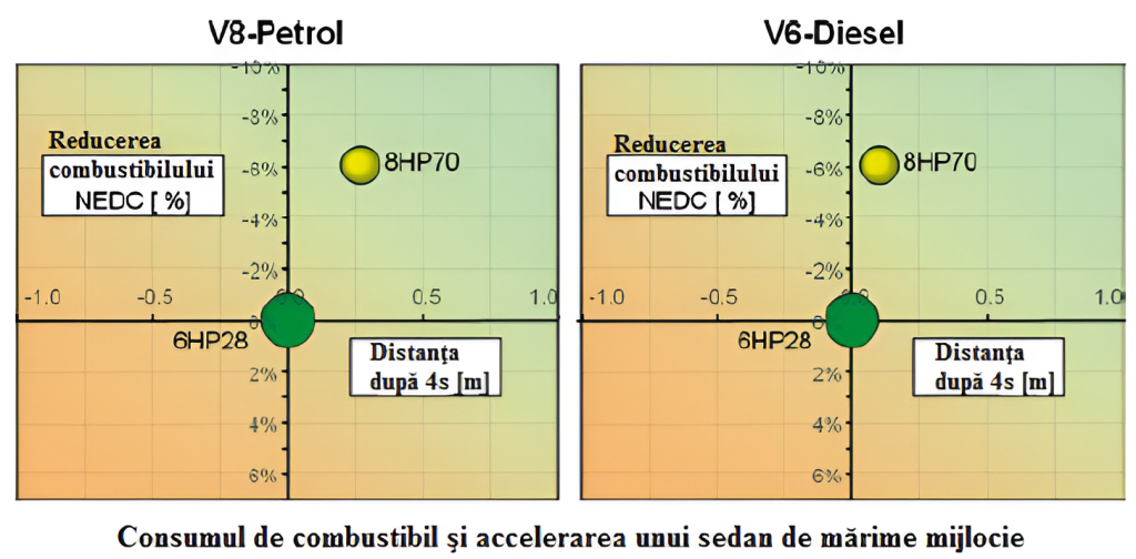 Acesta ilustrează o comparaţie a caracteristiclor sistemului de reducere a consumului transmisiei cu 8 trepte de viteză şi a celei de a doua generaţii 6 HP. Mai mult, noua transmisie 8HP ar trebui să fie comparabilă cu transmisia în 6 trepte de viteză în ceea ce priveşte cheltuielile de mecanică, sarcină şi costuri. În plus la eficienţa combustibilului şi a costurilor, o atenţie mărită este acordată plăcerii de a conduce. Noua transmisie 8 HP este o sinteză care rezolvă toate aceste conflicte.