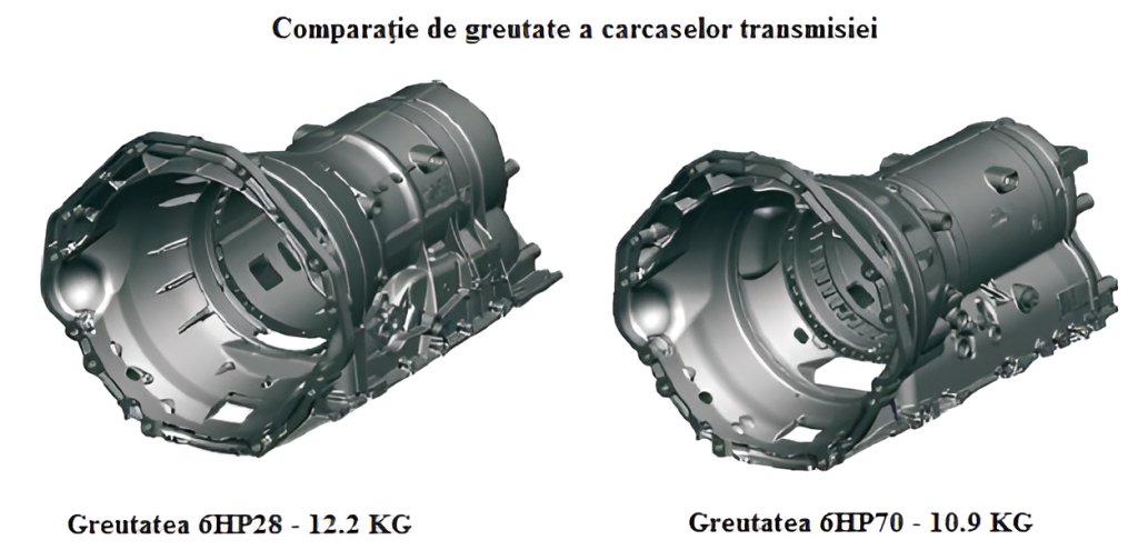 Datorită rigidităţii, carcasa de aluminiu a transmisiei este proiectată ca o piesă dintr-o bucată. Pentru a reduce greutatea, un alt pas a fost făcut înainte, s-a turnat un perete subţire din aluminiu. În urma testelor de optimizare, peretele subţire a fost redus pe anumite suprafeţe cu până la 3mm. Frecvenţa moştenită la flambaj este de 187Hz flambaj vertical şi 167Hz flambaj transversal. În comparaţie cu 6HP28, a fost atinsă o reducere a greutăţii carcasei de 1.3kg sau 10%. Pentru baia de ulei, a fost folosit un material plastic. Garniturile, filtrul şi magneţii au fost integraţi în baia de ulei, numărul de şuruburi bară/bolţuri a fost dramatic redus de la 21 la 13. Această reducere contribuie mai departe la diminuarea greutăţii şi optimizarea costului.