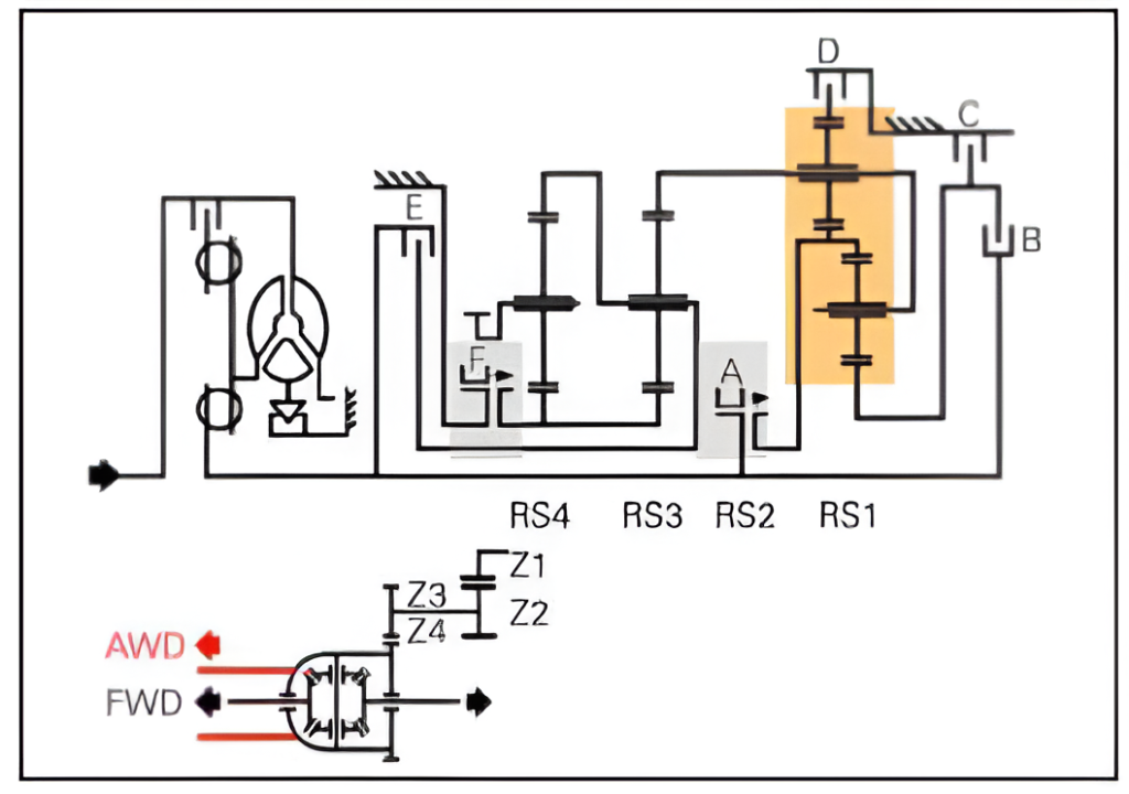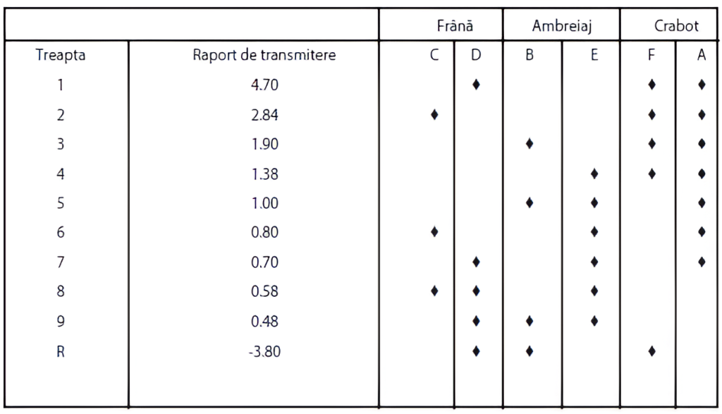 De exemplu pentru obținerea treptei 1 se cuplează ambele mecanisme cu craboți (A, F) și ambreiajul multidisc D. Până la treapta 5 cele două mecanisme cu craboți rămân cuplate iar realizarea treptelor se face cu ajutorul ambreiajelor și frânelor multidisc. Din punct de vedere al confortului treptele care implică decuplarea unui ambreiaj/frână multidisc și cuplare unui mecanism cu craboți sunt mai dificile deoarece mecanismele cu craboți nu permit controlul eficient al diferenței de turație (alunecarea) dintre elementele pe care le cuplează. Aceste schimbări de treaptă sunt: 9 – 7, 8 – 7 și 5 – 4. Totodată, prin controlul precis al cuplului motor în timpul schimbării treptelor de viteză, chiar dacă sunt utilizate mecanisme cu craboți, schimbarea treptei se poate face fără șocuri și fără să fie sesizată de conducătorul auto.