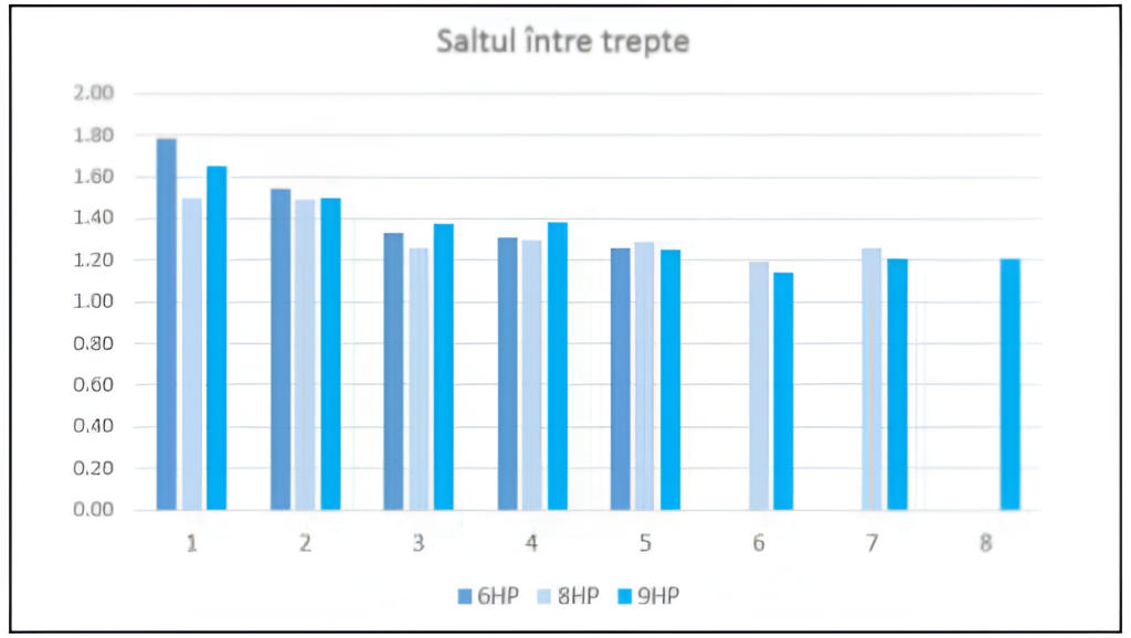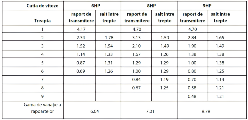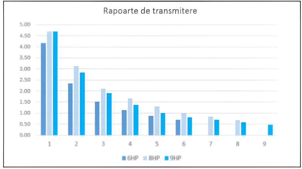 Comparație rapoarte de transmitere: 6HP (6 trepte), 8HP (8 trepte) și 9HP (9 trepte)- Sursă: ZF