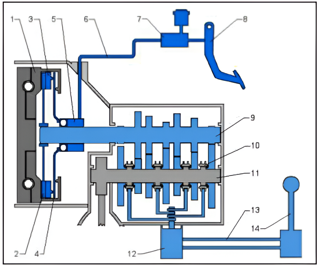Principiul de acţionare al ambreiajului este simplu. Când se doreşte decuplarea ambreiajului, motorul electric (4) este alimentat cu curent electric de modului electronic de control (1). Rotorul antrenează melcul (2) care antrenează roata melcată (3). Roata melcată antrenează biela (8) care apasă asupra pistonului (5) şi creşte presiunea lichidului din cilindru. Prin orificiul (6) lichidul sub presiune comunică cu un alt cilindrul şi pistonul ce acţionează rulmentul de presiune. Roata melcată (3) şi biela (8) au rol de bielămanivelă şi transformă mişcarea de rotaţie a rotorului (4) în mişcare de translaţie a pistonului (5).