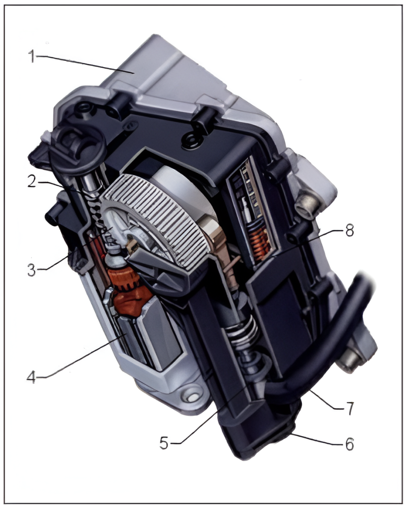 Actuatorul conţine o parte electrică, una mecanică şi una hidraulică. Partea electrică conţine motorul electric de curent continuu, partea mecanică conţine un angrenaj melc-roată melcată şi o bielă iar partea hidraulică conţine un cilindru şi un piston. Fluidul de lucru al circuitului hidraulic este lichid de frână.
