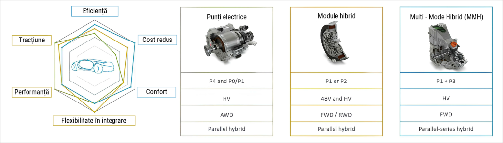 Modulele hibride oferă avantajul unei utilizări flexibile în cadrul unei platforme de agregate existente, precum și cupluri foarte mari pe osie care pot fi produse prin combinarea motorului electric și a motorului electric cu rapoartele de transmisie. Practic, modulele hibride pot fi combinate cu toate tipurile de transmisie. În prezent, modulele hibride avansate și scalate sunt utilizate din ce în ce mai frecvent în electrificarea vehiculelor comerciale [6].