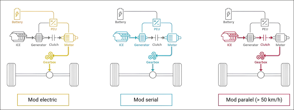 Arhitectura de bază a transmisiei hibride dedicate dezvoltate de Schaeffler este prezentată în figura 4. Construcția cu două motoare electrice, un ambreiaj și un raport de transmitere fix, fără schimbare de viteză, a fost aleasă pentru a permite atât funcționarea pur electrică, cât și în regim serial sau paralel. În modul pur electric sau în modul serial, acționarea se face în întregime prin intermediul motorului de tracțiune în poziția P3. În modul serial, motorul ICE cu generatorul în poziția P1 furnizează energia necesară și poate produce o funcționare în puncte dulci prin intermediul unei sarcini suplimentare pe generator, dacă este necesar. Ambreiajul este închis în modul paralel pentru a facilita acționarea mecanică directă prin intermediul motorului cu combustie internă. Motoarele electrice pot fi, de asemenea, utilizate ca acționare suplimentară (boost) sau în modul generator (schimbarea punctului de sarcină).