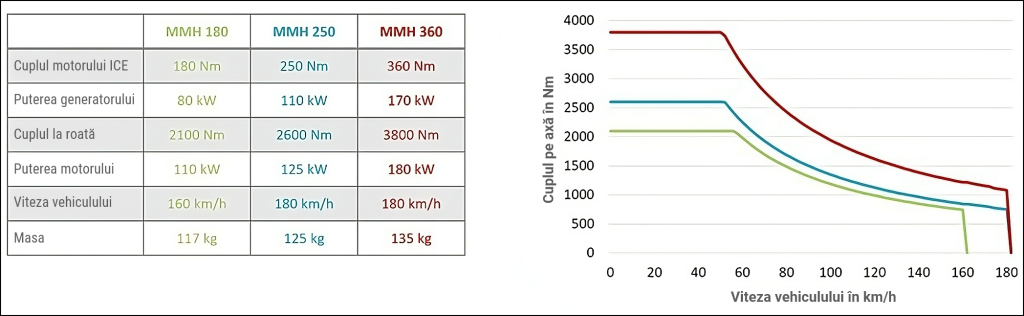 Complexitatea mecanică a transmisiei este extrem de redusă, cu doar trei angrenaje și unsprezece rulmenți. Designul de bază este destinat utilizării în aplicații față-transversale ca un design hibrid complet și hibrid plug-in. Se bazează pe o putere electrică inițială de 125 kW și produce un cuplu maxim pe osie de 2 600 Nm. Generatorul are o putere maximă de 110 kW și poate suporta cupluri de la ICE de până la 250 Nm pe arborele cotit. Vitezele maxime obținute corespund unei viteze a vehiculului de 180 km/h. Există planuri ulterioare de a oferi transmisia în alte două clase de cuplu/puteri. Factorul decisiv este cuplul maxim al ICE, deoarece acesta influențează definitiv limitele de funcționare ale întregii transmisii, figura 7. Pot fi utilizate motoare ICE de 80 până la 170 kW cu cupluri de la 180 la 360 Nm.