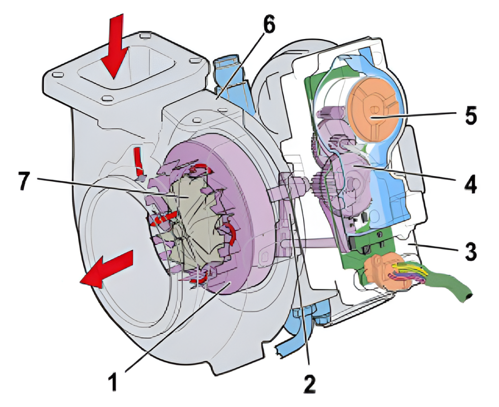 - Duză 2. Levier 3. Actuator 4. Raport de transmisie 5. Motor electric 6. Senzor de turaţie 7. Turbină