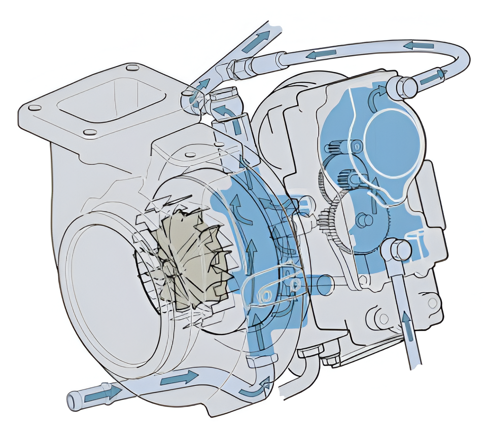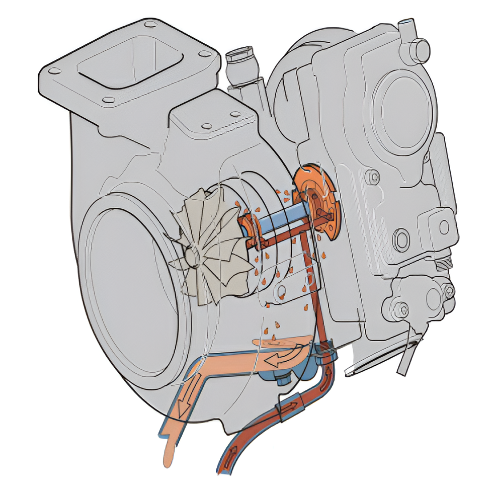 Turbocompresorul este lubrifiat şi răcit cu ulei de motor. Uleiul este presat în rulmenţi şi lubrifiază arborele, cu ulei apoi curge înapoi în baia de ulei, printr-o conductă de dimensiuni mari. Alimentarea cu ulei este absolut crucială pentru funcţionarea turbocompresorului. Turbocompresorul trebuie să aibă cantităţi mari