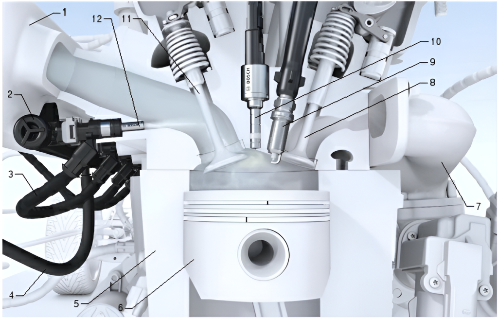 - galerie de admisie 2. rampă comună apă 3. cablu electric comandă injector apă 4. conductă de alimentare cu apă (de la pompă către rampă) 5. bloc motor 6. piston 7. galerie de evacuare 8. supapă de evacuare 9. bujie 10. injector combustibil (injecție directă de benzină) 11. supapă de admisie 12. injector apă