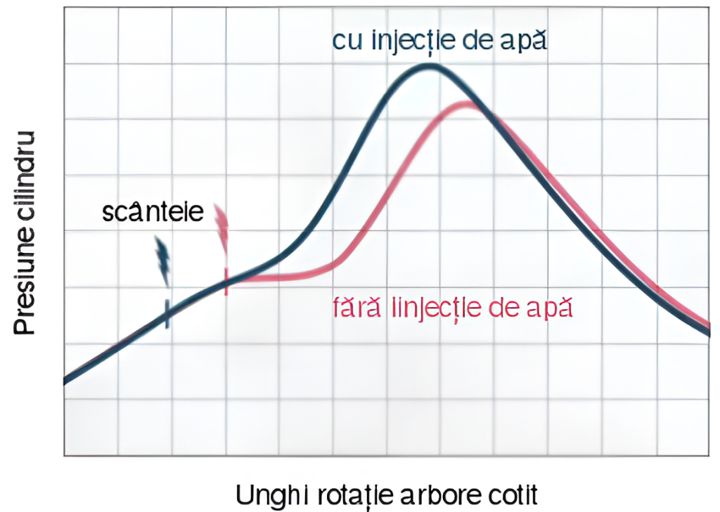 Principul injecției de apă este următorul. La motoarele cu ardere internă pe benzină, presiunea medie efectivă din cilindru are impact direct asupra cuplului motor. Cu cât avem o presiune mare în cilindru cu atât cuplul motor este mai mare. Presiune medie efectivă din cilindru depinde de o serie de factori printre care și avansul la aprindere (scânteie). Cu cât avansul față de PMI (punctul mort interior) este mai mare, cu atât presiune din cilindru în timpul arderii va fi mai mare.