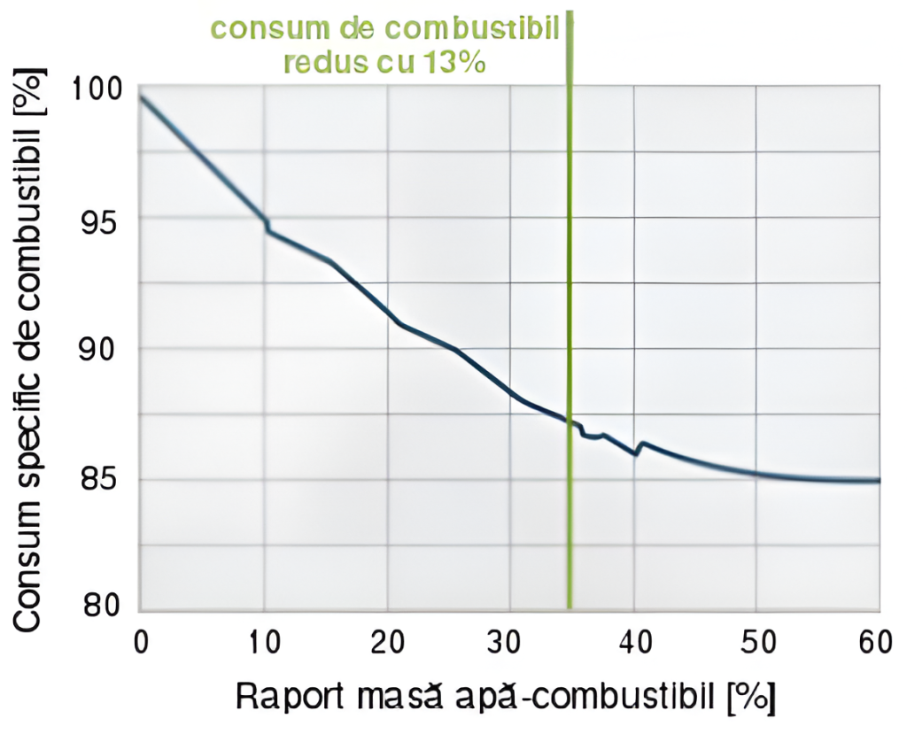 Reducerea consumului specific efectiv de combustibil depinde de raportul dintre masa de apă și combustibil. De asemenea, puterea motorului, datorită posibilității creșterii raportului de comprimare a motorului, poate fi îmbunătățită cu până la 5%.